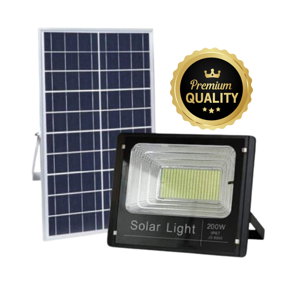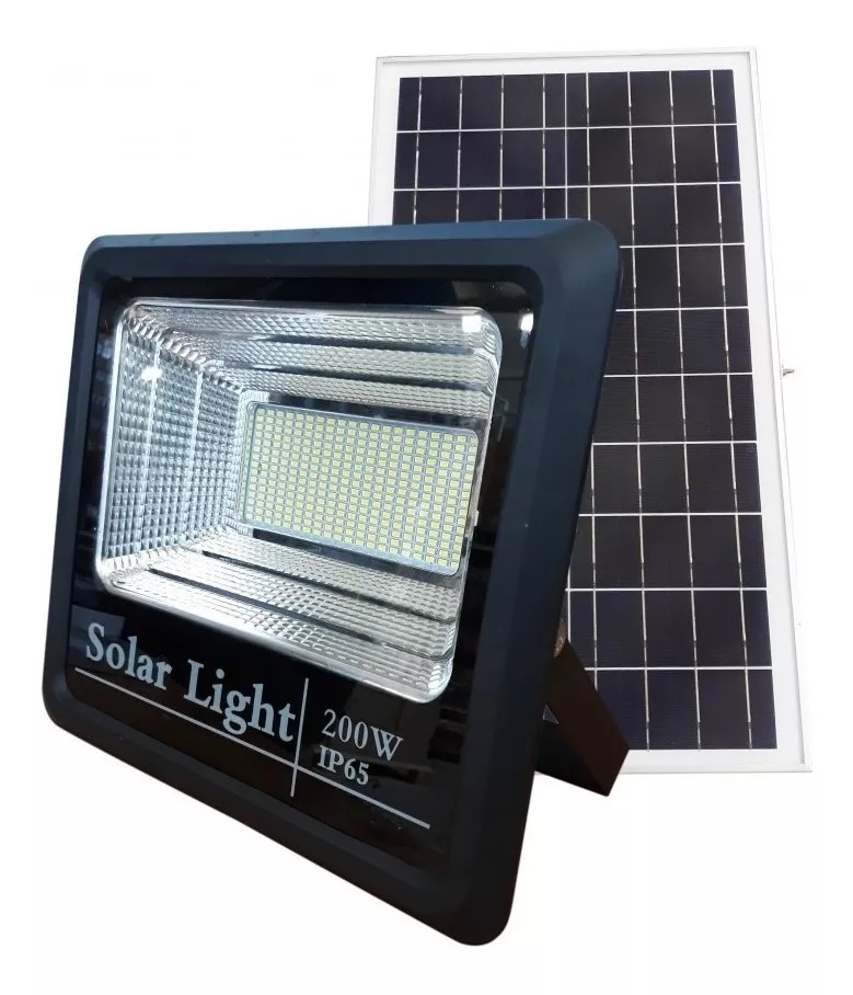 Reflector Solar 200w con panel solar semi integrado de 35w y baterias incluidas dentro del reflector, este reflector esta diseñado para estar a la intemperie, ideal para iluminar zonas comunes o senderos peatonales.